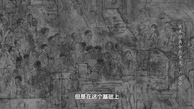 在画面中,画家没有设置固定光源,不强调光影、明暗效果,但即使在整体灰暗的色调下,除主要人物外,其他与会群众的面部也都清晰而生动。