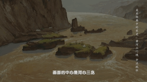 画面的中心是河心三岛,传说这是大禹治水时的“剑劈三门”,在黄河激流中就形成了“人门”“神门”和“鬼门”。