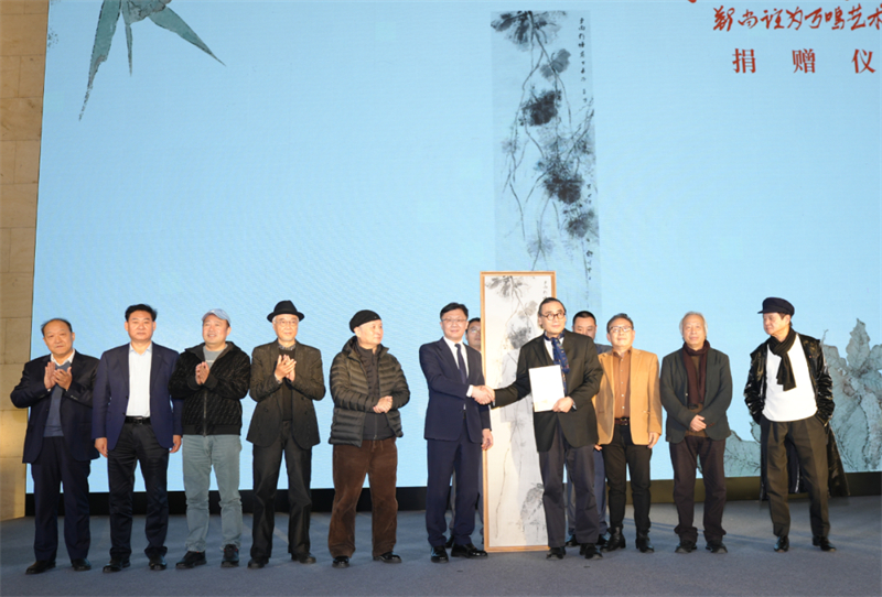 开幕式上,刘万鸣将精心创作的艺术作品赠予山东美术馆,由山东美术馆馆长杨晓刚代表山东美术馆接受捐赠,并向刘万鸣颁发收藏证书。
