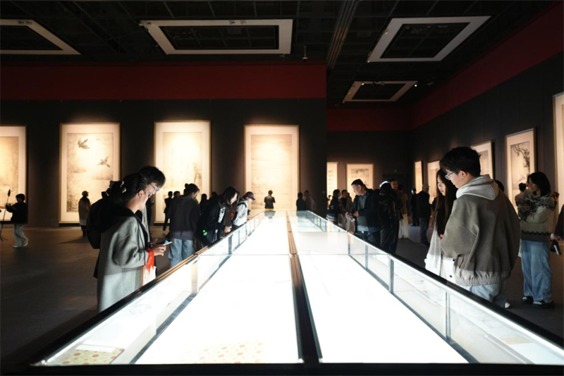 展览分为“搜妙”“觅趣”“尚朴”“创真”“求意”五个单元,立体呈现其艺术全貌,既是对其艺术成就的系统总结,也是对其创作理念的深度阐释。在“搜妙”单元,刘万鸣将花鸟画从传统书斋把玩引向了一种具有现代展厅张力的“大景花鸟”格局;在“觅趣”单元,他巧妙地将宋人“写生”转化为个人“写意”,尽展深度的“观物”之得;在“尚朴”单元,集中展示其书法作品,可见刘万鸣用笔追求“毛、涩、沉”,呈现出“大巧若拙”的审美高度;在“创真”单元,人物素描揭示了刘万鸣艺术体系中“以西润中”的深厚根基;在“求意”单元,刘万鸣的指画新作拓展了其花鸟画的语言边界,体现了一位成熟艺术家勇于打破工具局限、直指艺术本真——“意”的至高境界。