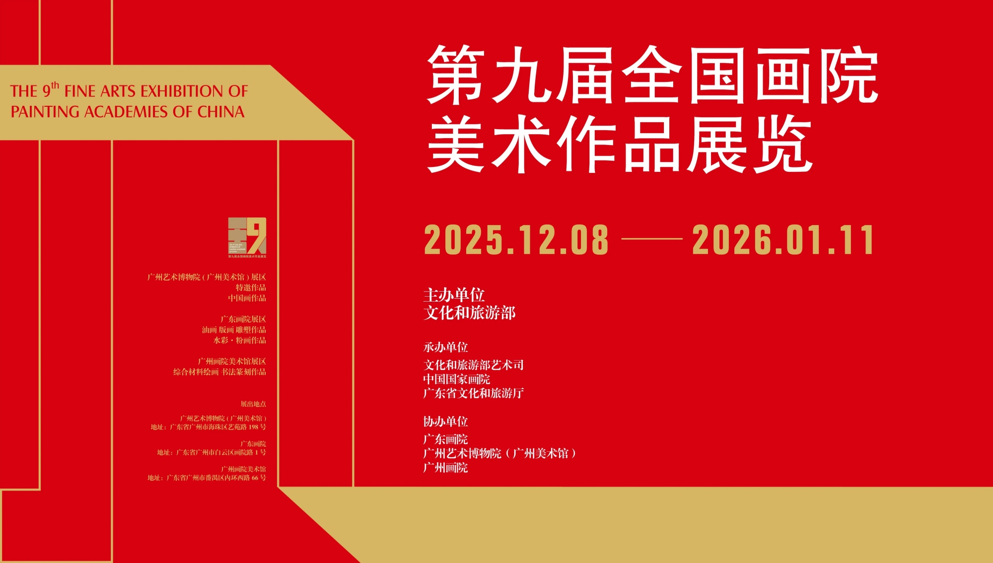 12月8日,由文化和旅游部主办,文化和旅游部艺术司、中国国家画院、广东省文化和旅游厅承办,广东画院、广州艺术博物院(广州美术馆)、广州画院协办的第九届全国画院美术作品展览在广州开展。